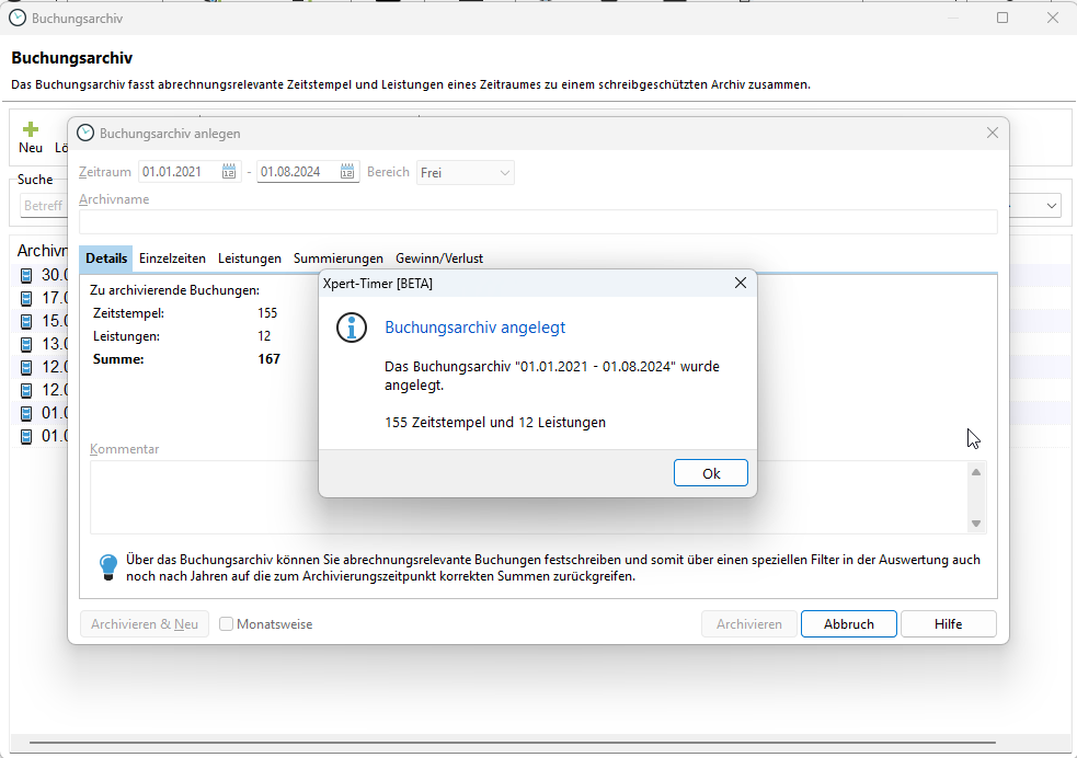 Sie erhalten daraufhin Feedback wie viele Zeitstempel und Leistungen für den Zeitraum archiviert wurden.