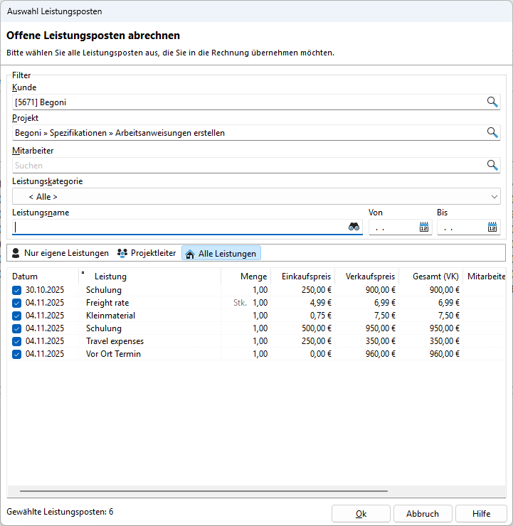 3.Erfassung von mehreren Leistungen während der Laufzeit des Projekts und Abrechnung dieser Leistungen über die Leistungsverwaltung, z.B. am Ende des Monats. Über das Menü "Fenster" und den Unterpunkt "Leistungen / Kosten" gelangen Sie zum Dialog "Leistungsverwaltung". Hier wählen Sie dann die entsprechenden Leistungsposten zur Abrechnung aus.