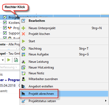 2.Abrechnung eines bestimmten Projekts über Rechtsklick auf das Projekt.