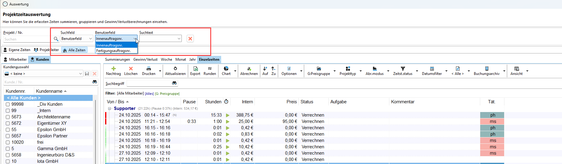 In der Auswertung können Sie Ihre Zeiten auf Basis dieser benutzerdefinierten Felder filtern. Nutzen Sie dazu das Suchfeld "Benutzerfeld", dann das entsprechende Benutzerfeld und den dort eingegebenen Text.