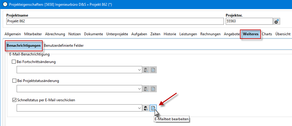 Im Reiter "Benachrichtigungen" klicken Sie auf den Knopf "E-Mail Text bearbeiten" um den Standardtext beim Versand der E-Mails zu ändern.
