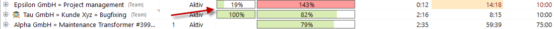 Mit der Spalte "Zeitverbrauch in %" behalten Sie den Überblick über Projekte, die zeitlich aus dem Ruder laufen. In unserem Beispiel Nr. 3 sehen Sie, dass bereits über 140% der geschätzten Zeit von 10 Stunden überschritten wurde. Tatsächlich haben die Mitarbeiter die Angabe gemacht, dass das Projekt erst zu 19% fertiggestellt ist. Hier läuft also etwas schief.