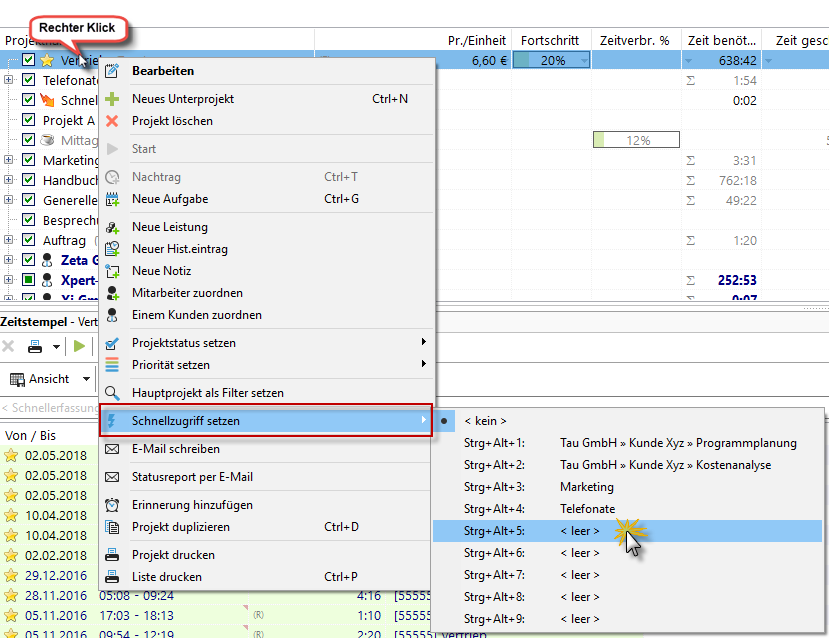 Hier können Sie ein Projekt rückwirkend starten. Diese Funktion können Sie nutzen, wenn Sie vergessen haben, ein Projekt umzuschalten. Wählen Sie mit der Maus das neue Projekt in Ihrem Projektmanager aus, und wählen Sie "Projekt rückwirkend starten". Jetzt werden Sie vom Xpert-Timer gefragt, zu welchem Zeitpunkt Sie das alte Projekt abschließen und das Neue beginnen möchten. |