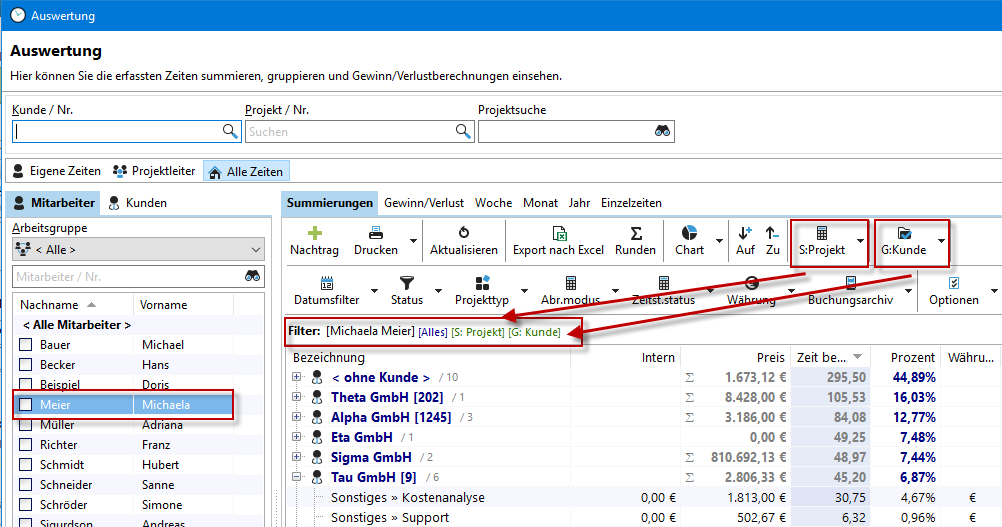 Über Ihrer Ergebnisliste sehen Sie in der Zeile "Filter", welche Daten Sie gefiltert haben. In unserem Beispiel sehen Sie alle erfassten Zeiten von der auf der linken Seite ausgewählten Mitarbeiterin Michaela Meier, summiert nach Projekt (S: Projekt) und gruppiert nach Kunde (G: Kunde). Unter den grafischen Buttons sehen Sie auch nochmal die ausgewählte Optionen (S:Projekt und G:Kunde). Möchten Sie den Filter über alle Mitarbeiter setzen, wählen Sie auf der linken Seite "Alle Mitarbeiter" aus. |