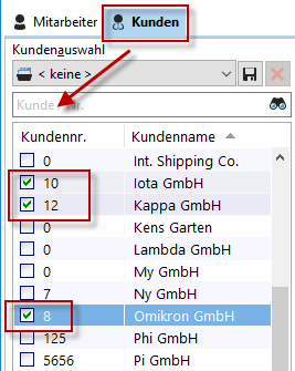 Der Reiter "Kunden" erlaubt Ihnen, Ihre Projekte nach einem, mehreren oder allen Kunden zu filtern. Um einen Kunden auszuwählen, setzen Sie den entsprechenden Haken in der Checkbox. Alternativ können Sie über das Suchfeld nach einem Kunden suchen, dessen Haken setzen und danach das Suchfeld wieder leeren.Die vorher gesetzten Haken bei den anderen Kunden bleiben dabei erhalten. So können Sie aus einer langen Liste von Kunden die gewünschten Kunden filtern.