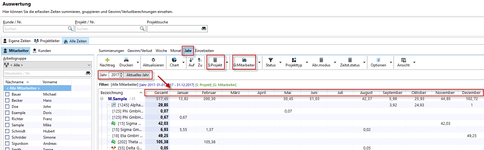 Mit der Jahresansicht erhalten Sie direkt einen Überblick über die angefallenen Projektzeiten pro Monat über das ganze Jahr. Die üblichen Filter und Gruppierungsmöglichkeiten stehen Ihnen zur Verfügung. Die Summierung nach Projekt und die Gruppierung nach Mitarbeiter wird eine der interessantesten Kombinationen sein.