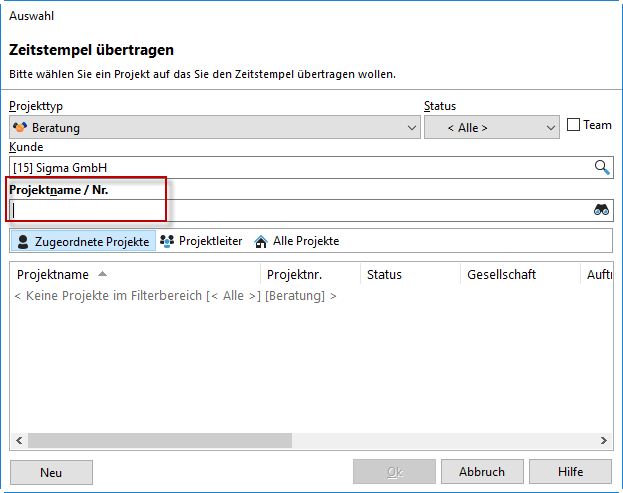 Sobald Sie dann das Projekt stoppen, werden Sie aufgefordert einen Projektnamen zu vergeben. Schnellstartprojekte werden immer auf Hauptprojektebene vergeben. Nur wenn Sie im Projektmanager einen Kunden markiert haben, wird das Schnellstartprojekt unter diesem Kunden erstellt, ansonsten müssen Sie das neu erstellte Projekt per Drag&Drop in das korrekte Hauptprojekt oder den entsprechenden Kunden ziehen.