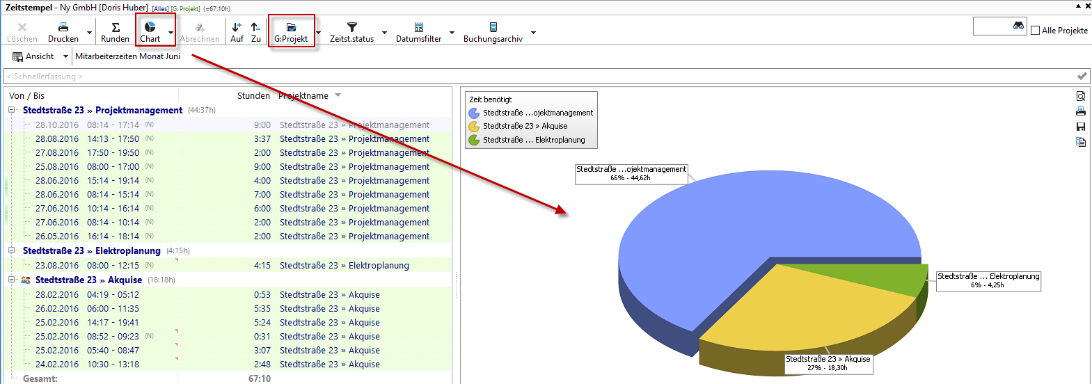 Ihre Zeitstempelliste bietet die Möglichkeit auch einen Chart einzublenden. Die Daten des Charts werden immer auf Basis der gewählten Gruppierung Ihrer Zeitstempel angezeigt. Im Beispiel wurde nach Projekt gruppiert, daher basiert auch die Grafik auf Projekte.