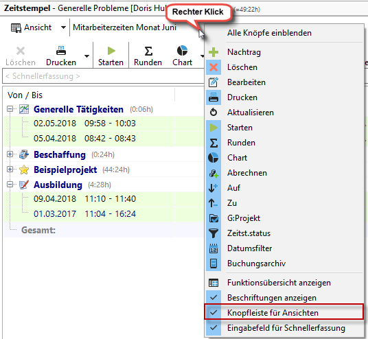 Mit einem Rechtsklick in den Menübereich der Zeitstempelliste sowie der Aufgabenliste und den Leistungen, können Sie wählen, ob Sie die gespeicherten Ansichten angezeigt bekommen möchten.