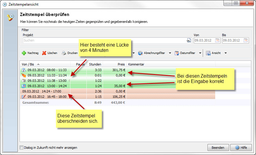 So sehen Sie auf einen Blick, ob Sie noch Änderungen an den Zeitstempeln vornehmen müssen.